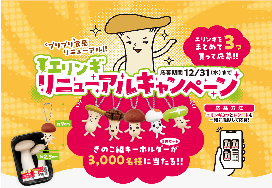 26年振りにエリンギが新品種になって登場!新エリンギ発売記念、エリンギを3つ買って応募できのこ組キーホルダー5体セットが当たる新エリンギキャンペーン実施中!