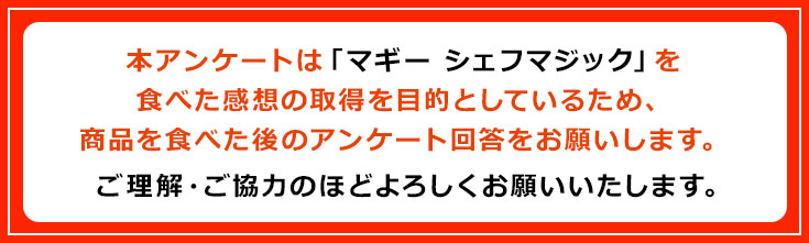 こちらのアンケートは株式会社エクスクリエが主催しております。メーカーや店舗へのお問い合わせはご遠慮ください。本アンケートに関するお問い合わせはお問い合わせ窓口まで。その場合には、必ずアンケート名(マギー シェフマジック)を記載してください。