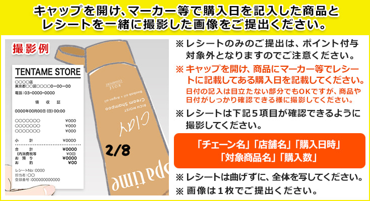 今回は商品(キャップを開け、商品にマーカー等でレシートに記載してある購入日を記入)と、レシートを一緒に撮影した画像をご提出ください。