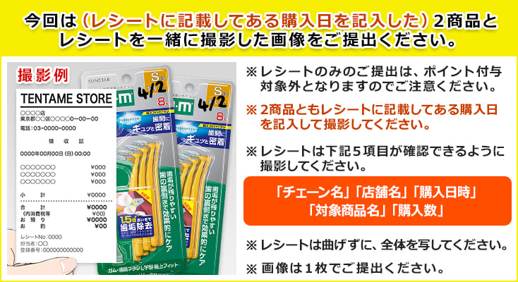 今回は2商品(レシートに記載してある購入日を記入)と、レシートを一緒に撮影した画像をご提出ください。