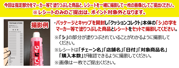 ・パッケージとキャップを開封し、「クッションコレクト」本体の「シ」の字をマーカー等で塗りつぶした商品とレシートを一緒に撮影して一枚の画像としてご提出ください。