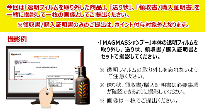 ・「MAGMASシャンプー」本体の透明フィルムを取り外し、送り状、領収書/購入証明書とセットで撮影してください。